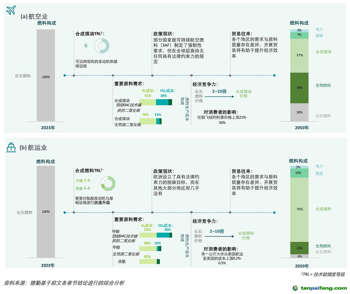 基于數(shù)據(jù)和模型的定量分析,德勤報(bào)告探討了合成燃料如何幫助海運(yùn)和航空業(yè)脫碳。雖然短期內(nèi)合成燃料的應(yīng)用受限,但長(zhǎng)期來(lái)看,它們將成為脫碳的關(guān)鍵推動(dòng)力。德勤預(yù)計(jì),為實(shí)現(xiàn)所需的合成燃料供應(yīng)水平,需要1.5億噸可持續(xù)氫氣和7億噸氣候中和二氧化碳,這需要對(duì)海運(yùn)和航空價(jià)值鏈進(jìn)行重大變革和協(xié)調(diào)努力。