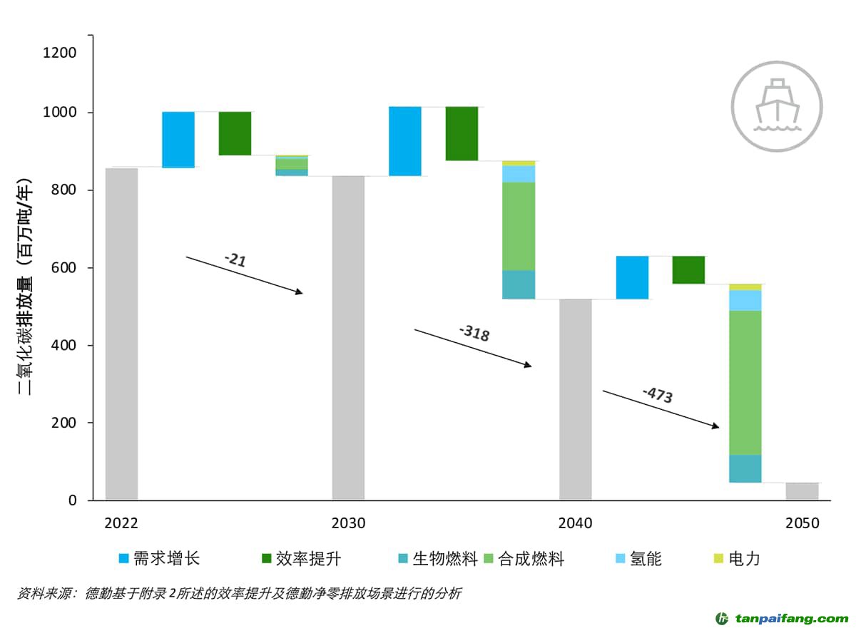 預(yù)計(jì)到2050年,海運(yùn)業(yè)將接近實(shí)現(xiàn)凈零碳排放的目標(biāo),這主要得益于合成燃料的使用。從2040年開(kāi)始,合成燃料將在海運(yùn)燃料結(jié)構(gòu)中占據(jù)重要份額。到2050年,僅氨和甲醇就將占海運(yùn)燃料的70%。 本*文@內(nèi)-容-來(lái)-自;中_國(guó)_碳^排-放*交-易^網(wǎng) t an pa i fa ng . c om
