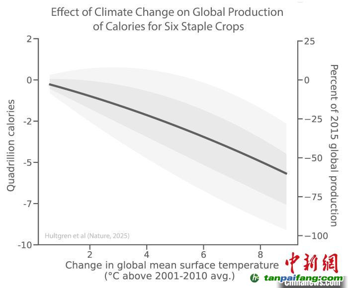 論文作者研究估計(jì),氣溫比工業(yè)化前水平每升高1°C,每人每天的產(chǎn)量就會(huì)下降120卡路里,相當(dāng)于當(dāng)前每日消耗量的4.4%。他們認(rèn)為,在高排放情景下,美國、中國東部、亞洲中部、非洲南部、中東到21世紀(jì)末的玉米產(chǎn)量可能最多下降40%,歐洲、非洲、南美的小麥損失為15%-25%,中國、俄羅斯、美國、加拿大的小麥損失為30%-40%。他們還指出,與無適應(yīng)措施情景相比,收入增長和實(shí)施適應(yīng)策略或使全球損失到2050年減少23%,到2100年減少34%。