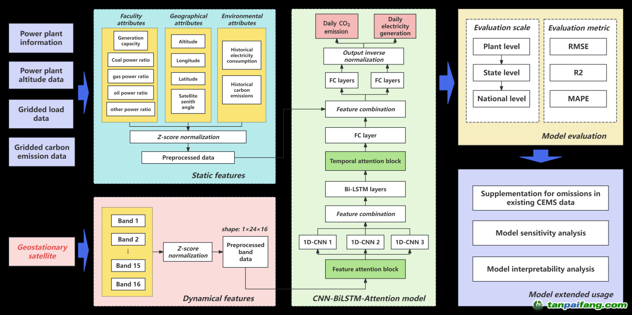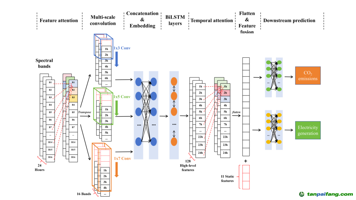 研究以美國環(huán)保署(EPA)管理的火電廠為研究對象,采用GOES-16地球靜止衛(wèi)星提供的多光譜遙感數(shù)據(jù)及火電廠相關(guān)靜態(tài)信息作為模型輸入,以火電廠日尺度的碳排放與發(fā)電量數(shù)據(jù)為預(yù)測目標(biāo),構(gòu)建端到端的監(jiān)測框架(圖1)。在算法設(shè)計上,模型融合了卷積神經(jīng)網(wǎng)絡(luò)(CNN)、雙向長短期記憶網(wǎng)絡(luò)(BiLSTM)和特征與時間雙重注意力機制(圖2),顯著提升了模型測算的準(zhǔn)確性與魯棒性。 本+文+內(nèi).容.來.自:中`國`碳`排*放*交*易^網(wǎng) t a np ai fan g.com