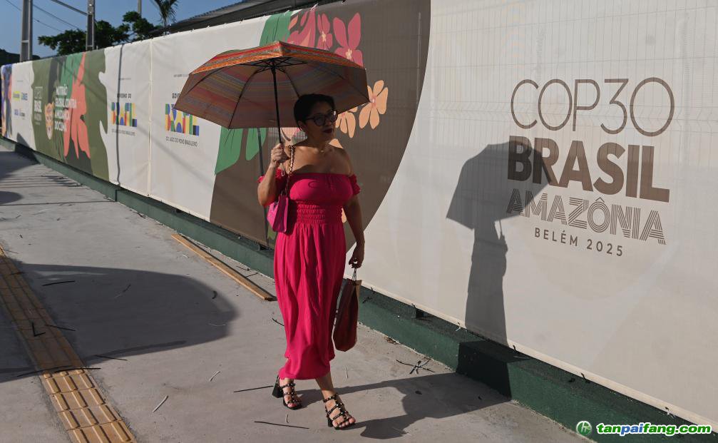 2025年11月4日,在巴西北部帕拉州貝倫市,行人從貝倫城市公園外《聯(lián)合國(guó)氣候變化框架公約》第三十次締約方大會(huì)(COP30)的標(biāo)識(shí)前經(jīng)過(guò)。新華社發(fā)(盧西奧·塔沃拉攝) 本`文@內(nèi)-容-來(lái)-自;中_國(guó)_碳排0放_(tái)交-易=網(wǎng) t an pa ifa ng . c om