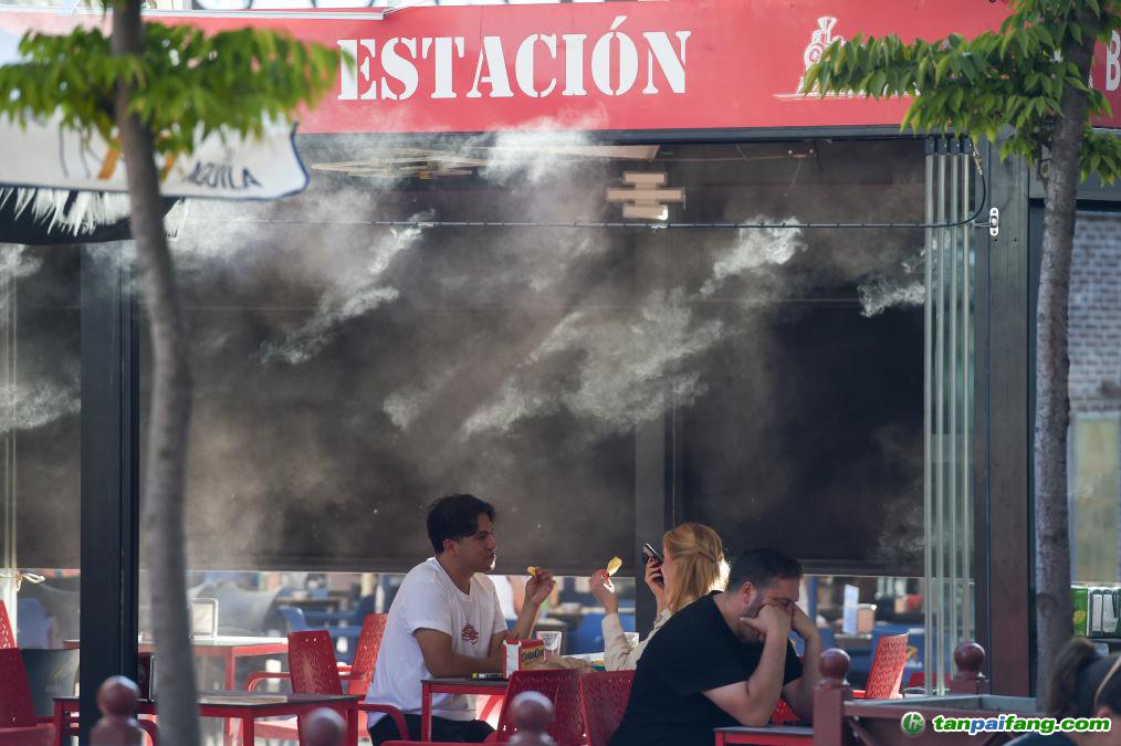 2025年9月17日,在西班牙馬德里,顧客在水霧裝置附近用餐。新華社發(fā)(古斯塔沃·巴連特?cái)z)