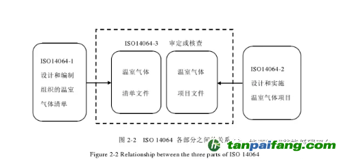 ISO 14064-1、ISO 14064-2 和 ISO 14064-3 這三個(gè)標(biāo)準(zhǔn)是相互統(tǒng)一的,適用的對(duì)象分別是組織、溫室氣體項(xiàng)目、審定員和核查員,所量化氣體有六種,包括二氧化碳(CO2)、甲烷(CH4)、氧化亞氮(N2O)、氫氟碳化物(HFCs)、全氟碳化物(PFCs)和六氟化硫(SF6)。ISO 14064 三部分標(biāo)準(zhǔn)之間具有一定的聯(lián)系,其中 ISO 14064-1與 ISO 14064-2 屬于相互平行的兩項(xiàng)標(biāo)準(zhǔn),分別是針對(duì)組織設(shè)計(jì)和編制溫室氣體清單以及溫室氣體相關(guān)項(xiàng)目設(shè)計(jì)和實(shí)施的要求,主要在使用對(duì)象上有明顯的區(qū)分。而ISO 14064-3 是針對(duì)組織和項(xiàng)目的溫室氣體清單審定和核查過(guò)程作出統(tǒng)一的要求,表明該三項(xiàng)標(biāo)準(zhǔn)之間是有緊密的聯(lián)系,如圖 2-2。