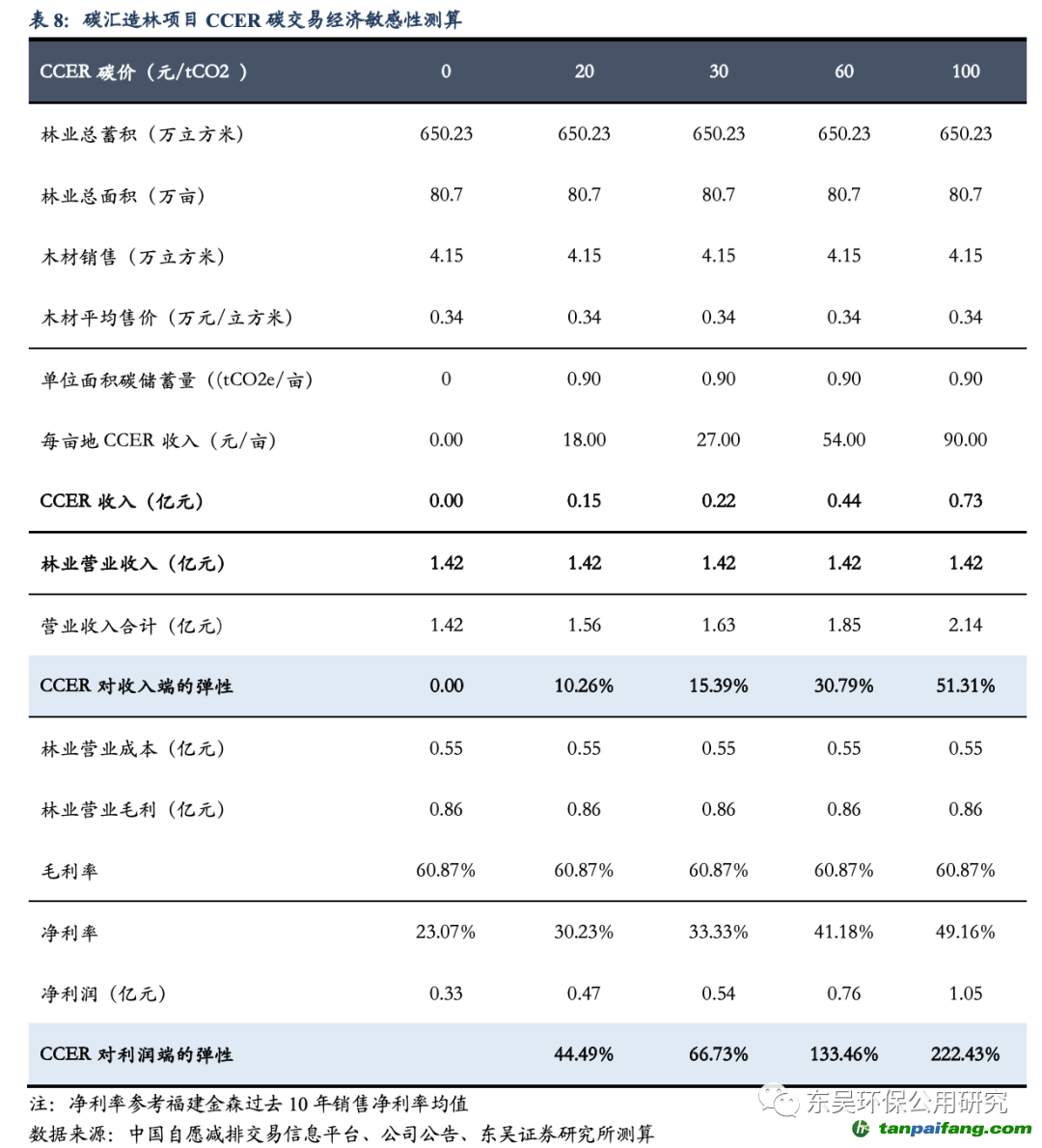 碳匯造林經(jīng)濟(jì)效益測(cè)算:CCER碳價(jià)30元情景下,每畝林地CCER收入達(dá)27.00元,對(duì)林業(yè)碳匯項(xiàng)目收入端彈性達(dá)15.39%,利潤(rùn)端彈性達(dá)66.73%,凈利率提升10.26pct至33.33%;CCER碳價(jià)60元情景下,每畝林地CCER收入達(dá)54.00元,對(duì)林業(yè)碳匯項(xiàng)目收入端彈性達(dá)30.79%,利潤(rùn)端彈性達(dá)133.46%,凈利率提升18.11pct至41.18%。 本文`內(nèi)-容-來-自;中_國(guó)_碳_交^易=網(wǎng) tan pa i fa ng . c om