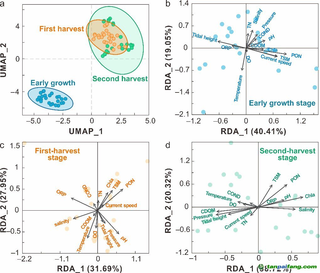 不同養(yǎng)殖階段碳匯指標的UMAP降維分析及碳相關變量與環(huán)境因子的冗余分析結果。