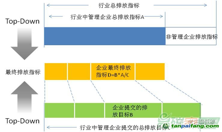 政府在收到企業(yè)的減排目標(biāo)及減排計劃后,會根據(jù)企業(yè)自身能力及總體的減排目標(biāo)進行調(diào)整,調(diào)整總體思路是自上而下(Top-Down)與自下而上(Button-Up)相結(jié)合的方式。具體操作如下-根據(jù)國家總體減排目標(biāo)(韓國的BAU對比降低30%)以行業(yè)為基準(zhǔn)制定總體排放指標(biāo)(減排指標(biāo))A-某個企業(yè)提交的經(jīng)過政府認證的排放指標(biāo)為B-經(jīng)過政府認證的,考慮到行業(yè)內(nèi)各企業(yè)的合理的排放目標(biāo)(由企業(yè)提供)總和為C-則每個企業(yè)的最終排放指標(biāo)D則為B×A/C