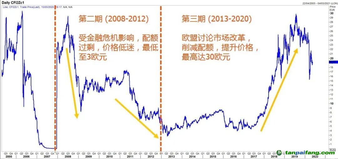 由于受到2008-2009年金融危機(jī)的影響,歐洲企業(yè)排放量大幅下降和碳排放配額(EUA)供給嚴(yán)重過剩,碳價(jià)一直低迷。2018年歐盟正式通過了新的市場改革措施,確定將收緊配額供給并實(shí)施市場穩(wěn)定儲(chǔ)備機(jī)制 (Market Stability Reserve), 提升了市場信心,碳價(jià)大幅回漲,一度接近30歐元/噸,目前約在20歐元/噸。 夲呅內(nèi)傛萊源?。骇鎲┨?排*放^鮫*易-網(wǎng) τā ńpāīfāńɡ.cōm