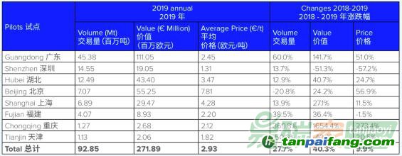 圖:2019 年中國碳排放交易體系試點(diǎn)交易匯總(圖表來源:路孚特碳市場年度回顧)