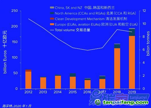 從全球來看,碳排放配額的交易總量在2018年迅猛增長了45%之后,在2019年下降了約4%。