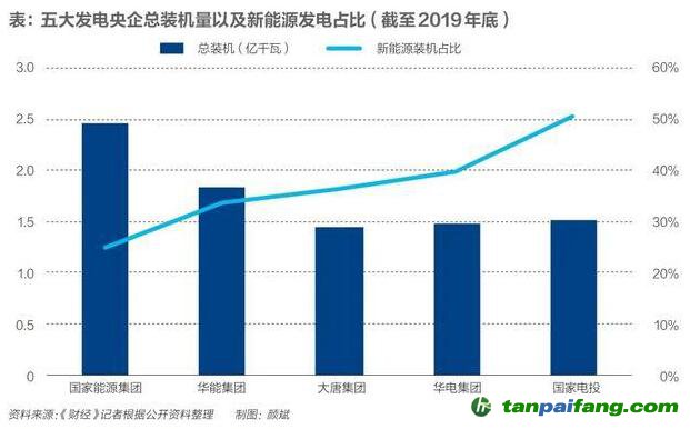 在五大發(fā)電集團里,可再生能源占比最高的國家電投集團的壓力就比國家能源集團小得多,該集團的火電裝機總量不到國家能源集團的一半,碳排放總量也不到后者的一半。截至2019年底,國家電投集團的可再生能源裝機占比已超過50%。