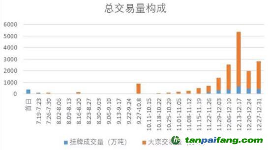 一是價格(掛牌價)較為穩(wěn)定,整體呈不規(guī)則“浴盆”曲線。如圖1,全國碳市場價格整體在40-60元之間,開市首周實現(xiàn)了價格的較快上漲,短暫突破60元,其后1個月內(nèi)價格呈下降趨勢,隨后價格長期維持在43元上下橫盤。橫盤期也是成交量急劇縮量期(如圖2)。進入12月份,隨著履約截止日迫近,成交量快速放量,價格持續(xù)上升。半年周期來看,價格周K圖呈不規(guī)則“浴盆”曲線,平均掛牌價格為47.16元/噸。