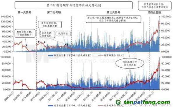 圖1 2005年4月至2021年EUA現(xiàn)貨與期貨成交量與結(jié)算價(jià),數(shù)據(jù)來(lái)源:Wind,中大咨詢整理