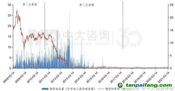 圖2 2008年至2021年3月22日CER期貨成交量與結(jié)算價,數(shù)據(jù)來源:Wind,中大咨詢整理