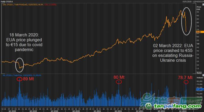 近幾日內(nèi),不斷升級(jí)的俄烏沖突使得悲觀情緒籠罩歐洲碳市場(chǎng),投資者紛紛減倉和大幅甩賣碳配額。3月1日,碳價(jià)暴跌近20%,12月期貨交易量則高達(dá)7870萬噸。這幾乎是EUA標(biāo)桿合約日交易量的歷史最高水平,接近于2020年3月18日的8900萬噸日交易量。