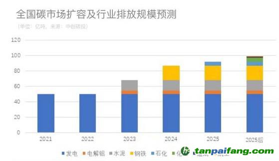 將發(fā)電行業(yè)外的其他七個(gè)行業(yè)納入之后,全國碳市場的配額總量將從目前的 45 億噸擴(kuò)容到 70 億噸,覆蓋全國二氧化碳排放總量的60%左右。