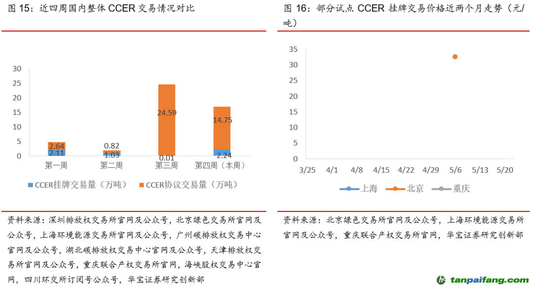 本周(5月16日-5月22日)全國(guó)整體碳信用(CCER)二級(jí)交易市場(chǎng)交易量下滑。從交易量上看,本周CCER交易量下降30.92%,主要是上海、深圳、天津等地CCER交易量下滑。根據(jù)可跟蹤到的碳試點(diǎn)CCER掛牌交易價(jià)格,近2個(gè)月僅有一單北京的CCER掛牌交易價(jià)格公布,2022年5月6日為32.5元/噸。 內(nèi).容.來(lái).自:中`國(guó)*碳-排*放*交*易^網(wǎng) t a npai fa ng.com