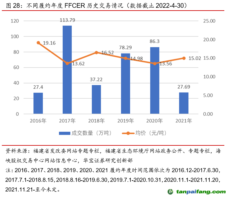 截止2022年4月,F(xiàn)FCER交易量已達(dá)370.69萬(wàn)噸,但活躍度仍舊缺乏,平均碳價(jià)為14.70元/噸,相比其他減排量?jī)r(jià)格或當(dāng)?shù)嘏漕~價(jià)格偏低。比較福建、廣東、北京這三個(gè)試點(diǎn)自有的碳減排量交易情況:1)交易量上,福建林業(yè)碳匯交易量高于北京林業(yè)碳匯交易量,低于廣東PHCER交易量,從減排量交易量與備案減排量之比來(lái)看,福建FFCER該指標(biāo)為1.15,即一噸福建FFCER在被簽發(fā)后被交易1.15次,而廣東PHCER該指標(biāo)為2.79,由此可見(jiàn)福建FFCER交易仍不夠活躍;2)價(jià)格上,福建FFCER價(jià)格低于北京、廣東自有減排量的價(jià)格,主要受到各市場(chǎng)對(duì)應(yīng)的普通碳配額價(jià)格的影響。比較福建試點(diǎn)交易平臺(tái)中普通碳配額(FJEA)、CCER、FFCER交易情況:1)交易量上,F(xiàn)FCER交易量約為FJEA或CCER交易量的1/3左右,CCER交易量幾乎與FJEA持平;2)價(jià)格上,CCER價(jià)格高于FJEA、高于FFCER,F(xiàn)FCER價(jià)格較低主要受到FJEA價(jià)格本身價(jià)格不高以及福建配額供給政策的影響。從不同履約年度歷史交易情況來(lái)看,F(xiàn)FCER交易量與價(jià)格均處于波動(dòng)狀態(tài),價(jià)格波動(dòng)較小,基本穩(wěn)定在15元/噸上下。