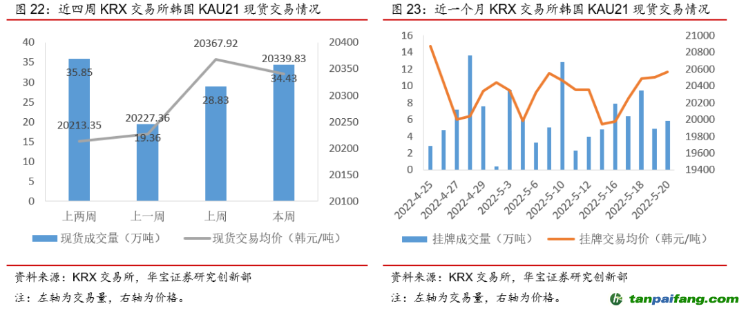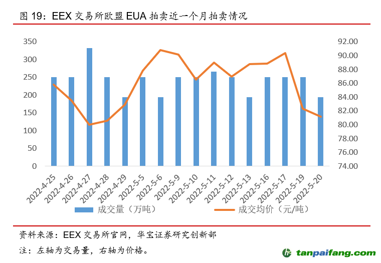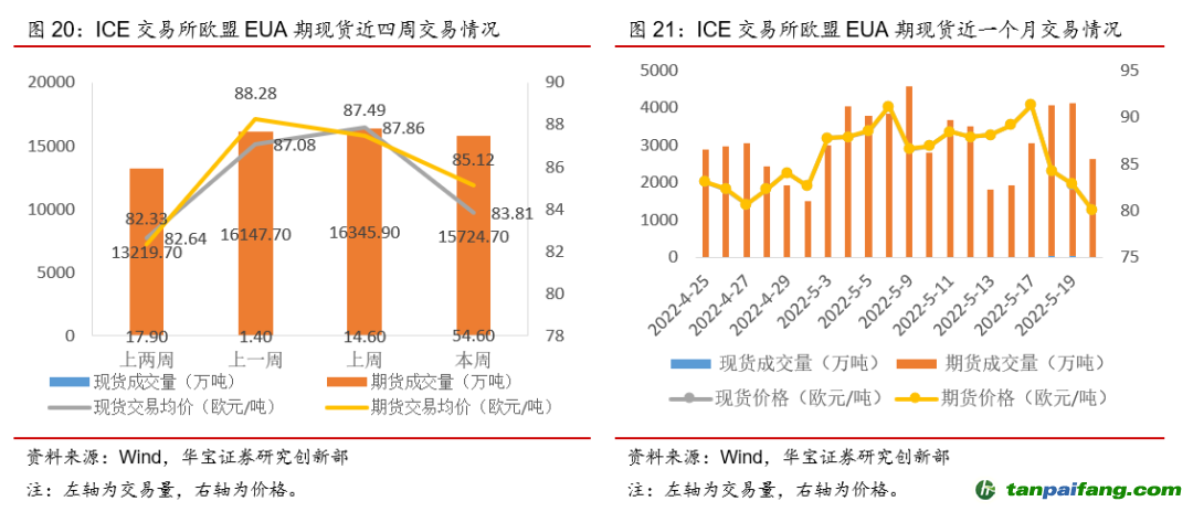 本周(5月16日-5月22日)國(guó)外碳配額二級(jí)市場(chǎng)交易量漲跌不一,但碳價(jià)均有所回落。歐盟市場(chǎng)本周EUA現(xiàn)貨成交量上升273.97%,期貨成交量下降3.80%,現(xiàn)貨成交均價(jià)下降4.61%,期貨成交均價(jià)下跌2.70%,周內(nèi)期現(xiàn)貨碳價(jià)跌幅均超10%。從本周價(jià)格走勢(shì)來(lái)看,周一、周二價(jià)格呈上漲趨勢(shì),主要由于本周二歐洲議會(huì)的環(huán)境、公共衛(wèi)生和食品安全委員會(huì)(ENVI)投票通過(guò)了關(guān)于歐盟碳排放交易體系(EU ETS)修訂的報(bào)告以及關(guān)于建立歐盟碳邊境調(diào)節(jié)機(jī)制(CBAM)法規(guī)的報(bào)告,兩個(gè)報(bào)告相比原歐盟委員會(huì)提案中內(nèi)容更加嚴(yán)格,碳價(jià)因此上漲;周三歐盟委員會(huì)提出REPowerEU計(jì)劃,減少對(duì)俄羅斯化石燃料的依賴并加快綠色能源轉(zhuǎn)型,其中在談及支持計(jì)劃實(shí)施的基金額外資金來(lái)源時(shí),歐盟委員會(huì)建議在不擾亂碳市場(chǎng)的情況下通過(guò)拍賣出售市場(chǎng)穩(wěn)定儲(chǔ)備機(jī)制(MSR)中的EUA以獲得200億歐元的資金補(bǔ)充,按照5月17日的EUA現(xiàn)貨價(jià)格,相當(dāng)于后續(xù)增加約2.2億噸的碳配額供給,此外疊加天然氣價(jià)格的持續(xù)走低,EUA價(jià)格在下半周呈大幅下跌趨勢(shì),跌幅超過(guò)10%。韓國(guó)市場(chǎng)本周KAU21現(xiàn)貨成交量漲幅為19.41%,平均碳價(jià)有所下降,跌幅為0.14%,但周內(nèi)碳價(jià)呈上漲趨勢(shì)。 本+文`內(nèi)/容/來(lái)/自:中-國(guó)-碳-排-放-網(wǎng)-tan pai fang . com