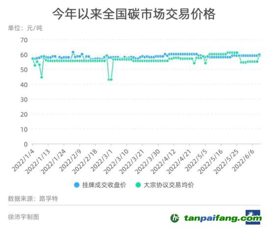 然而,二季度全國碳市場的交易數據更加慘淡。4月、5月,以及6月頭兩周,大多數交易日的掛牌交易量都只有10噸,4月和5月的大宗交易總量也僅有不足300萬噸;交易價格則保持在55元—60元/噸之間。