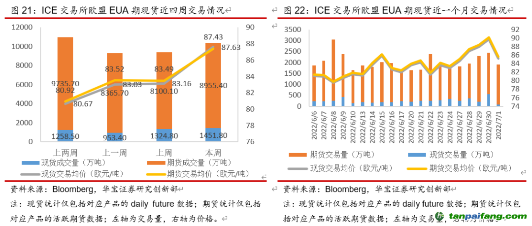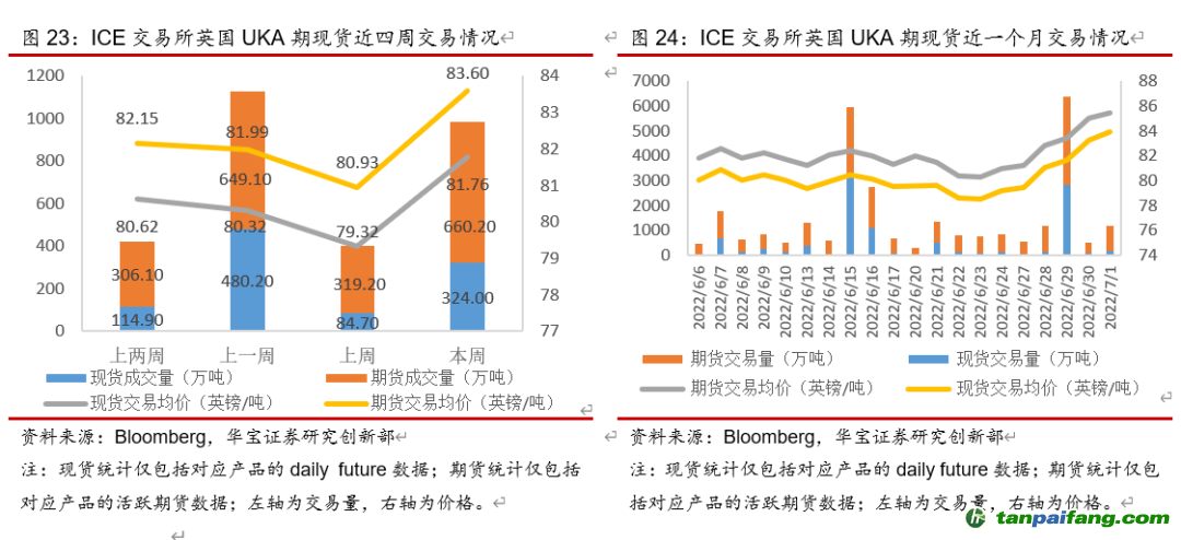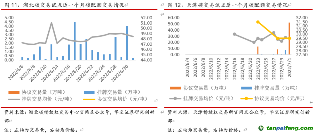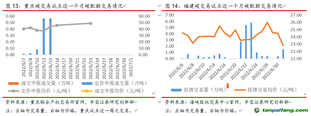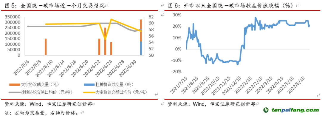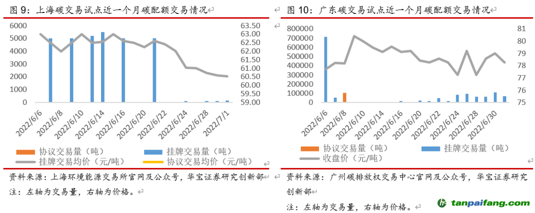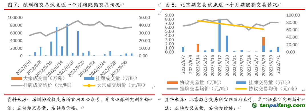 整體來看,本周(6月27日-7月3日)全國整體碳配額交易市場活躍度上漲,主要是試點成交量增加。本周碳配額二級市場成交量共計162.82萬噸,其中全國碳市場交易量32.5萬噸,同比下降37.52%,主要是線下協(xié)議交易量減少較多、同比減少61.54%,碳試點交易量130.32萬噸,同比上漲103.11%,大部分試點市場交易量回升,天津、廣東由于履約截止日(8月10日)臨近、交易量增加較多,分別同比增長391.56%、106.75%。本周碳配額二級市場成交額共計8087萬元,其中全國碳市場交易額1875萬元,同比下降37.71%,碳試點交易額6212萬元,同比上漲90.84%。從線上周均價上看,全國碳市場均價58元/噸,同比下降2.86%,碳試點平均碳價47.67元/噸,同比下降6.04%,大部分試點周均碳價下降,其中北京、深圳碳價降幅較大,分別同比下降11.96%、7.04%。 禸嫆@唻洎:狆國湠棑倣茭昜蛧 τāńpāīfāńɡ.cōm