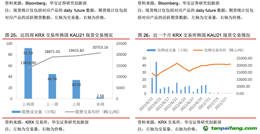 本周(7月4日-7月10日)國外碳配額二級市場交易量整體趨于下行,碳價漲跌不一。歐盟市場本周EUA拍賣量同比上升30.09%,拍賣周均價下降3.02%,周內(nèi)呈震蕩走勢;二級市場EUA期現(xiàn)貨成交量分別下降20.16%、40.68%,期現(xiàn)貨成交均價分別下降4.21%、5.20%,周內(nèi)期現(xiàn)貨碳價震蕩下跌,后半周碳價走勢與天然氣價格走勢類似。本周英國無拍賣,二級市場本周UKA期現(xiàn)貨成交量與碳價均有所降低,期現(xiàn)貨成交量分別降低37.56%、70.09%,期現(xiàn)貨碳價分別下降0.87%、1.27%,周內(nèi)碳價一路下跌。韓國市場本周KAU21現(xiàn)貨成交量大幅下降,僅為2.58萬噸,同比下降92.42%,但平均碳價上漲6.89%。 內(nèi)/容/來/自:中-國-碳-排-放*交…易-網(wǎng)-tan pai fang . com