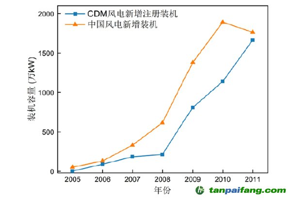 (圖1)2005-2011中國風(fēng)電與CDM風(fēng)電新增裝機容量圖源:網(wǎng)絡(luò) 內(nèi).容.來.自:中`國*碳-排*放*交*易^網(wǎng) t a npai fa ng.com
