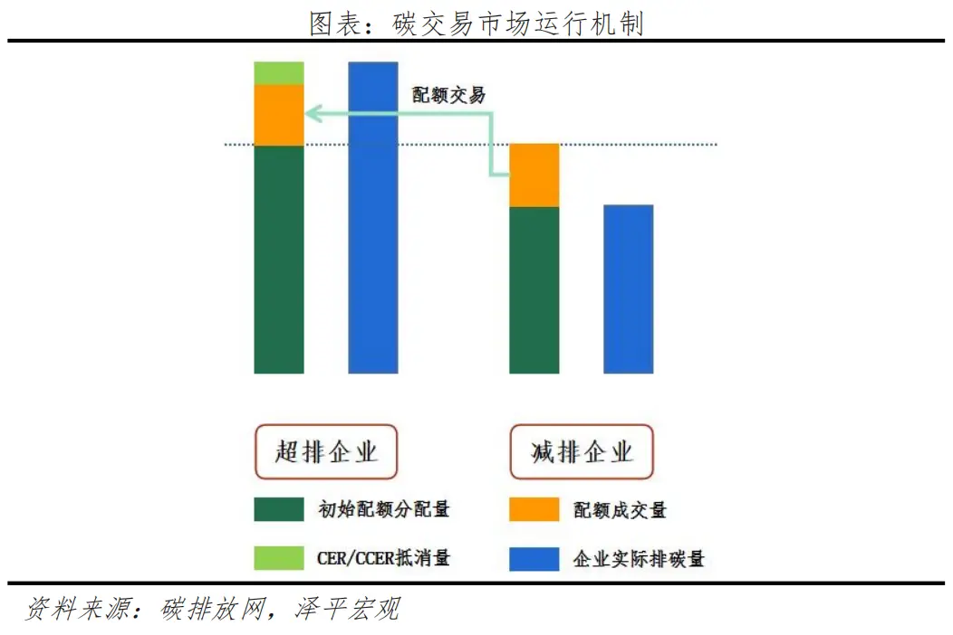 碳排放配額運行機制相對簡單。政策為各類企業(yè)設定一定的碳排放配額量,此時市場上同時存在超排企業(yè)與減排企業(yè)。當超排企業(yè)的碳排放量超標時,可以通過碳交易市場從減排企業(yè)處購買盈余額度。通過市場交易機制,實現碳排放額度的有效分配,最終以相對較低的成本實現控排目標。