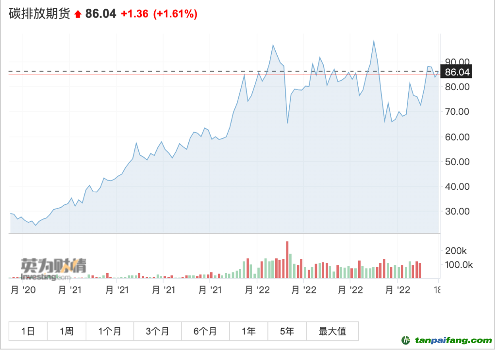 媒體分析指出,更嚴(yán)格的碳排放規(guī)則已使今年的碳價(jià)達(dá)到每公噸創(chuàng)紀(jì)錄的99.22 歐元(105 美元)。截至發(fā)稿,歐洲碳排放指標(biāo)期貨上漲約1.61%,至 83.82 歐元,為五年前的10倍。 本`文內(nèi).容.來.自:中`國`碳`排*放*交*易^網(wǎng) t a npai fan g.com
