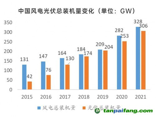 國務(wù)院發(fā)布的《2030年前碳達峰行動方案》指出,到2030年,風(fēng)電、太陽能發(fā)電總裝機容量達到12億千瓦(1200GW)以上。根據(jù)2021年數(shù)據(jù)統(tǒng)計,目前風(fēng)電、光伏的裝機容量進程已過半、達到52.5%。