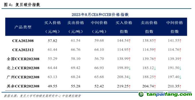 試點(diǎn)碳市場(chǎng)約使用3200萬(wàn)噸,2021年全國(guó)首個(gè)履約周期核銷約使用3300萬(wàn)噸,再除去2022年及 2023年碳市場(chǎng)使用量,當(dāng)前CCER存量約1000萬(wàn)噸。隨履約期限逼近,預(yù)計(jì)CCER市場(chǎng)需求和價(jià)格均會(huì)上升。復(fù)旦大學(xué)可持續(xù)發(fā)展研究中心2023年8月碳價(jià)指數(shù)顯示,市場(chǎng)履約使用CCER的買(mǎi)入價(jià)格指數(shù)為138.99,賣(mài)出價(jià)格指數(shù)為139.76,中間價(jià)格指數(shù)為139.39,均較上月有所上漲。