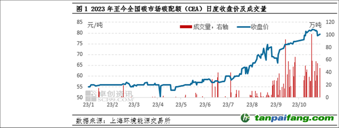 從2023年初至10月30日,根據(jù)上海環(huán)境能源交易所公布的全國碳市場交易數(shù)據(jù),我們可以觀察到全國碳市場在6月份之后呈現(xiàn)出明顯的“前冷后熱”現(xiàn)象。在前六個月內(nèi),全國碳市場基本保持在56元/噸左右的穩(wěn)定價格區(qū)間內(nèi)小幅波動,交易量也相對平淡。然而,自6月份起,全國碳市場開始復蘇,呈現(xiàn)出量價齊升的趨勢:據(jù)統(tǒng)計,6月1日至10月30日,全國碳市場