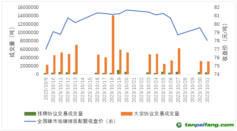 10月全國碳市場碳排放配額(CEA)總成交量9305.13萬噸,總成交額64.22億元。掛牌協(xié)議交易月成交量752.75萬噸,月成交額6.03億元。大宗協(xié)議交易月成交量8552.38萬噸,月成交額58.18億元。截至10月31日,CEA累計成交量3.83億噸,累計成交額206.64億元。 內-容-來-自;中_國_碳_0排放¥交-易=網(wǎng) t an pa i fa ng . c om