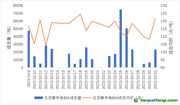 10月北京碳市場碳排放配額(BEA)線上成交量40.79萬噸,成交額4675.98萬元,成交均價114.64元/噸。10月最后一個交易日成交均價121.72元/噸,較9月最后一個交易日成交均價123.03元/噸下跌1.06%。截至10月31日,BEA累計成交量5452.25萬噸(公開交易1944.13萬噸,協(xié)議轉讓3508.12萬噸),累計成交額27.90億元。