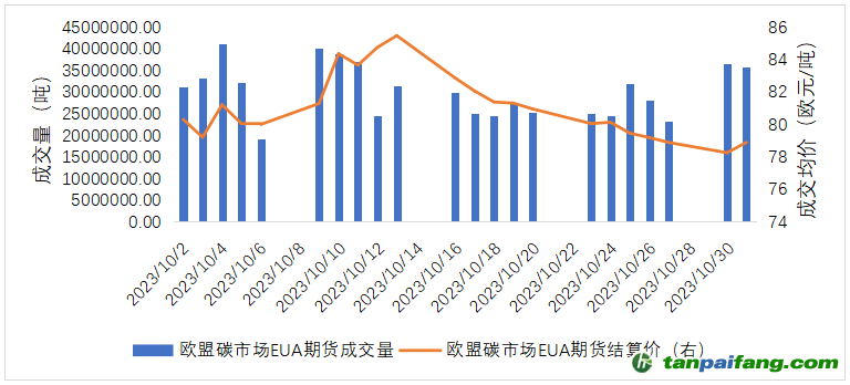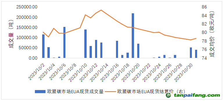 10月歐盟碳排放配額(EUA)現(xiàn)貨成交量124.40萬噸,期貨成交量6.65億噸。10月EUA現(xiàn)貨結算價最低78.25歐元/噸,最高85.26歐元/噸;期貨結算價最低78.25歐元/噸,最高85.45歐元/噸。 本`文@內-容-來-自;中_國_碳排0放_交-易=網(wǎng) t an pa ifa ng . c om