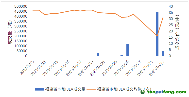 10月福建碳市場碳排放配額(FJEA)成交量64.74萬噸,成交額1365.64萬元。10月最后一個交易日收盤價31.30元/噸,較9月最后一個交易日收盤價36.74元/噸下跌14.81%。