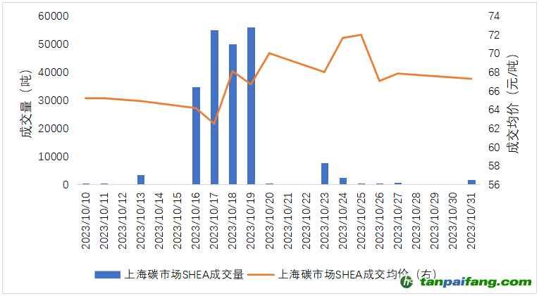 北京碳市場10月開展了2022年度碳排放配額第二次有償競價,由于10月末為履約期,為滿足企業(yè)交易需求,臨時開放10月28日、10月29日周末交易,配額成交量顯著上升。10月下旬上海碳價一度走高,成交均價突破70元/噸,最高達到71.99元/噸。10月31日,上海環(huán)境能源交易所開展了2022年度上海碳排放配額第一次有償競價,發(fā)放數(shù)量為100萬噸。 本文+內-容-來-自;中^國_碳+排.放_交^易=網(wǎng) t a n pa ifa ng .c om