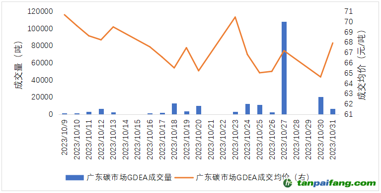 10月廣東碳市場碳排放配額(GDEA)成交量20.41萬噸,成交額1361.56萬元。期間,最高成交價76.00元/噸,最低成交價63.50元/噸,成交均價66.70元/噸。10月最后一個交易日收盤價67.91元/噸,較9月最后一個交易日收盤價68.07元/噸下跌0.24%。截至10月31日,GDEA累計成交量2.21億噸,累計成交額61.73億元。