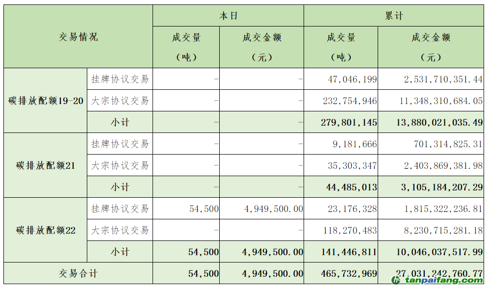 截至今日,全國碳排放權(quán)交易市場累計(jì)成交總量465,732,969噸,累計(jì)成交總額27,031,242,760.77元。