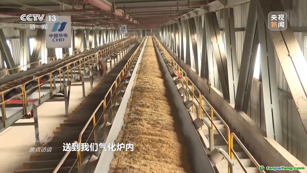湖北華電襄陽發(fā)電有限公司生物質運維部副主任 楊濤:生物質燃料通過皮帶進料口送到氣化爐內,產生一氧化碳、氫氣、甲烷等可燃氣體,然后通過管道將可燃氣體送到燃煤鍋爐內與燃煤混合燃燒,實現(xiàn)了生物質與燃煤機組的耦合發(fā)電。