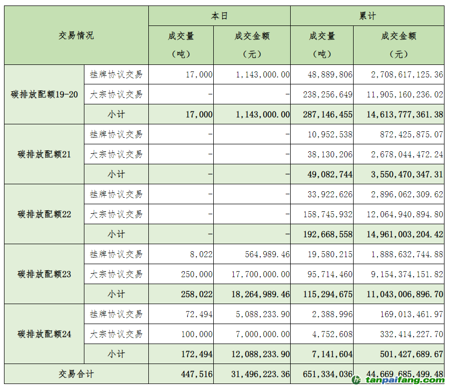 截至今日,全國碳排放權(quán)交易市場累計成交總量651,334,036噸,累計成交總額44,669,685,499.48元。 本`文@內(nèi)-容-來-自;中^國_碳0排0放^交-易=網(wǎng) ta n pa i fa ng . co m