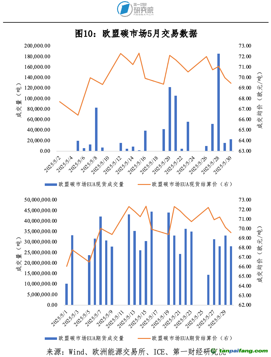 5月EUA現(xiàn)貨成交量81.80萬噸,結(jié)算價(jià)最低66.45歐元/噸,最高72.34歐元/噸;期貨成交量6.89億噸,結(jié)算價(jià)最低66.08歐元/噸,最高72.36歐元/噸。