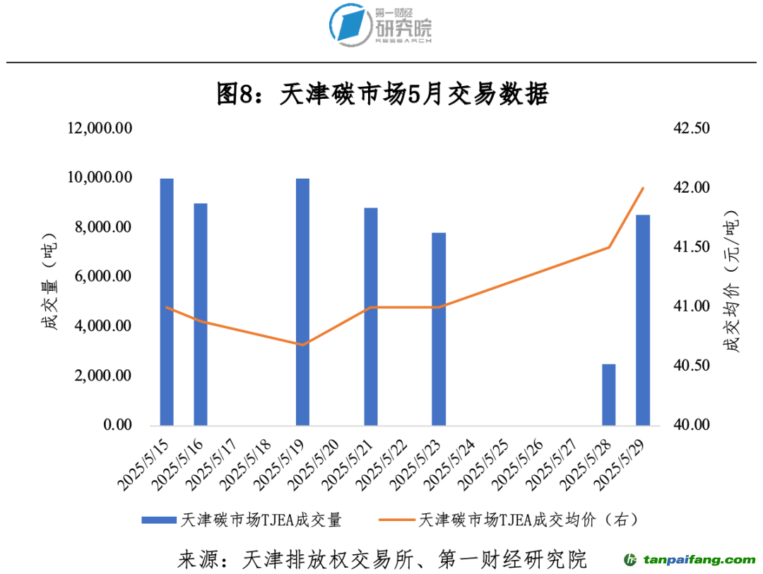5月天津碳市場(chǎng)碳排放配額(TJEA)總成交量56630噸,總成交額232.73萬元,均為競(jìng)價(jià)交易,無協(xié)議交易發(fā)生。截至5月31日,TJEA累計(jì)成交量4546.70萬噸,累計(jì)成交額11.62億元。