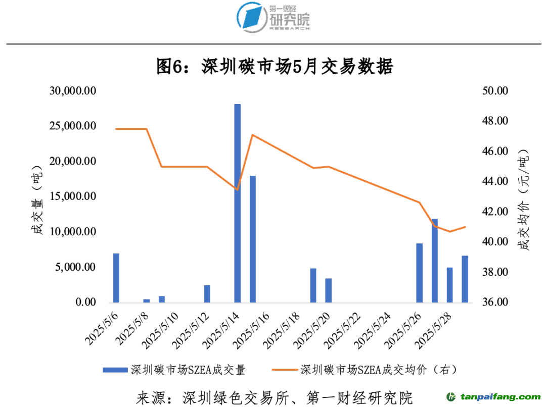 5月深圳碳市場(chǎng)碳排放配額(SZEA)成交量97505噸,成交額428.64萬元。期間,最高價(jià)47.85元/噸,最低價(jià)40.50元/噸,成交均價(jià)43.96元/噸。5月最后一個(gè)交易日收盤價(jià)41.01元/噸,較4月最后一個(gè)交易日收盤價(jià)46.00元/噸下跌10.85%。截至5月31日,SZEA累計(jì)成交量7834.72萬噸,累計(jì)成交額21.04億元。