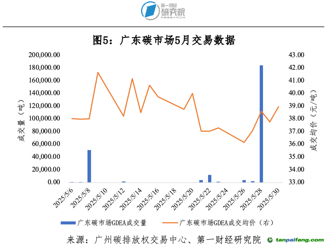 5月廣東碳市場(chǎng)碳排放配額(GDEA)成交量26.07萬噸,成交額999.48萬元。期間,最高價(jià)41.80元/噸,最低價(jià)36.00元/噸,成交均價(jià)38.34元/噸。5月最后一個(gè)交易日收盤價(jià)38.97元/噸,較4月最后一個(gè)交易日收盤價(jià)38.07元/噸上漲2.36%。截至5月31日,GDEA累計(jì)成交量2.30億噸,累計(jì)成交額66.86億元。