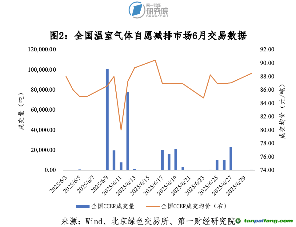 全國碳市場碳排放配額(CEA)價格經(jīng)歷持續(xù)下跌后于6月反彈回升,月末價格約為75元/噸。掛牌協(xié)議成交均價為74.03元/噸,較5月上漲5.38%。 本`文@內(nèi)/容/來/自:中-國^碳-排-放^*交*易^網(wǎng)-tan pai fang. com