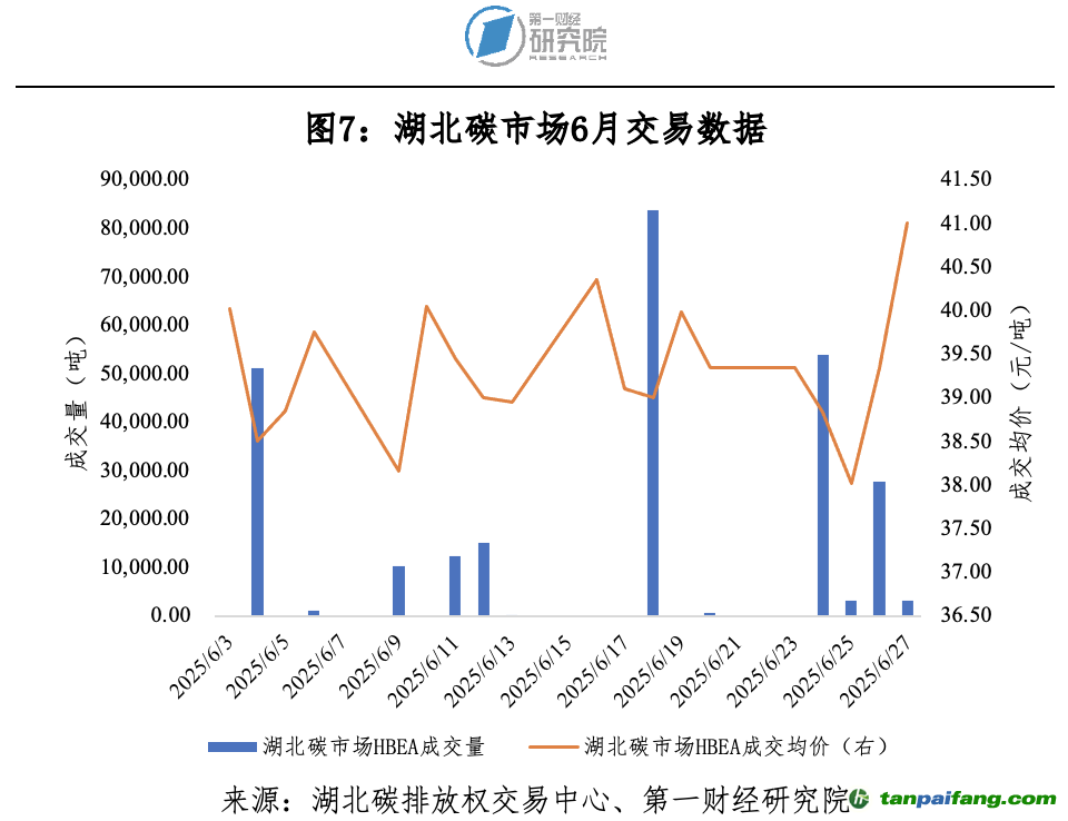 6月湖北碳市場碳排放配額(HBEA)交易成交量26.30萬噸,成交額1023.27萬元。期間,最高價42.81元/噸,最低價37.00元/噸,成交均價38.91元/噸。6月最后一個交易日收盤價41.00元/噸,較5月最后一個交易日收盤價40.44元/噸上漲1.38%。截至6月30日,HBEA(不包括逆回購和還碳)累計成交量4.18億噸,累計成交額103.28億元。