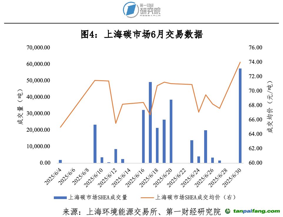 6月上海碳市場碳排放配額(SHEA)掛牌交易成交量30.89萬噸,成交額2169.70萬元,成交均價70.24元/噸。6月最后一個交易日成交均價74.02元/噸,較5月最后一個交易日成交均價65.00元/噸上漲13.88%。截至6月30日,SHEA累計成交量5656.25萬噸(掛牌交易2532.74萬噸,協(xié)議轉讓3123.51萬噸),累計成交額18.33億元。