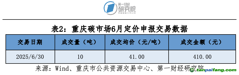6月重慶碳市場碳排放配額(CQEA)定價申報交易成交量10噸,成交額410.00元,成交均價41.00元/噸。6月無成交申報交易發(fā)生。