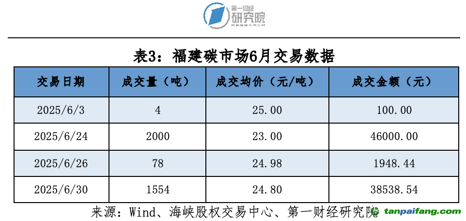 6月福建碳市場碳排放配額(FJEA)成交量3636噸,成交額8.66萬元。6月最后一個交易日收盤價24.80元/噸,較5月最后一個交易日收盤價25.00元/噸下跌0.80%。