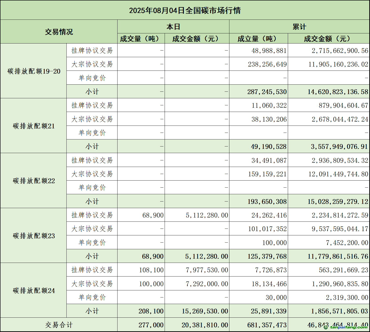 截至今日,全國碳排放權交易市場累計成交總量681,357,473噸,累計成交總額46,843,464,814.4元。